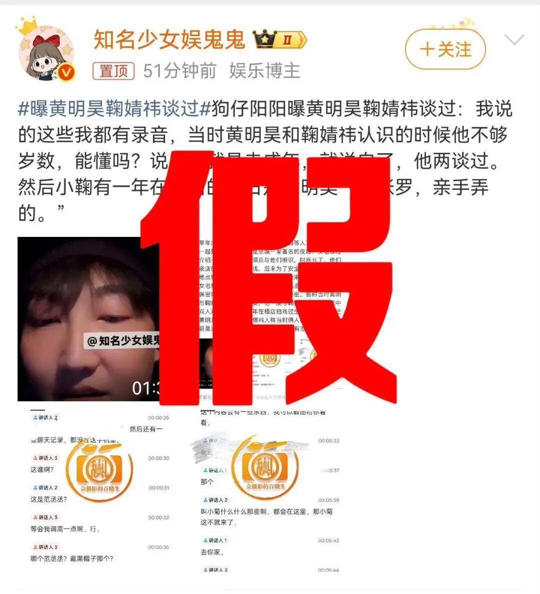 1日晚,@黄明昊信昊接收中 否认:"假!!!",鞠婧祎方对接也辟谣为"假"。双方都否认了恋情传闻。