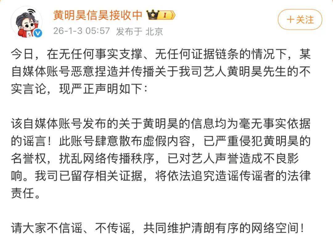 此前报道:昨夜至今日凌晨,一名拥有数十万微博粉丝的女博主发布多位明星爆料。对此,黄明昊工作室发布声明:毫无事实依据的谣言!